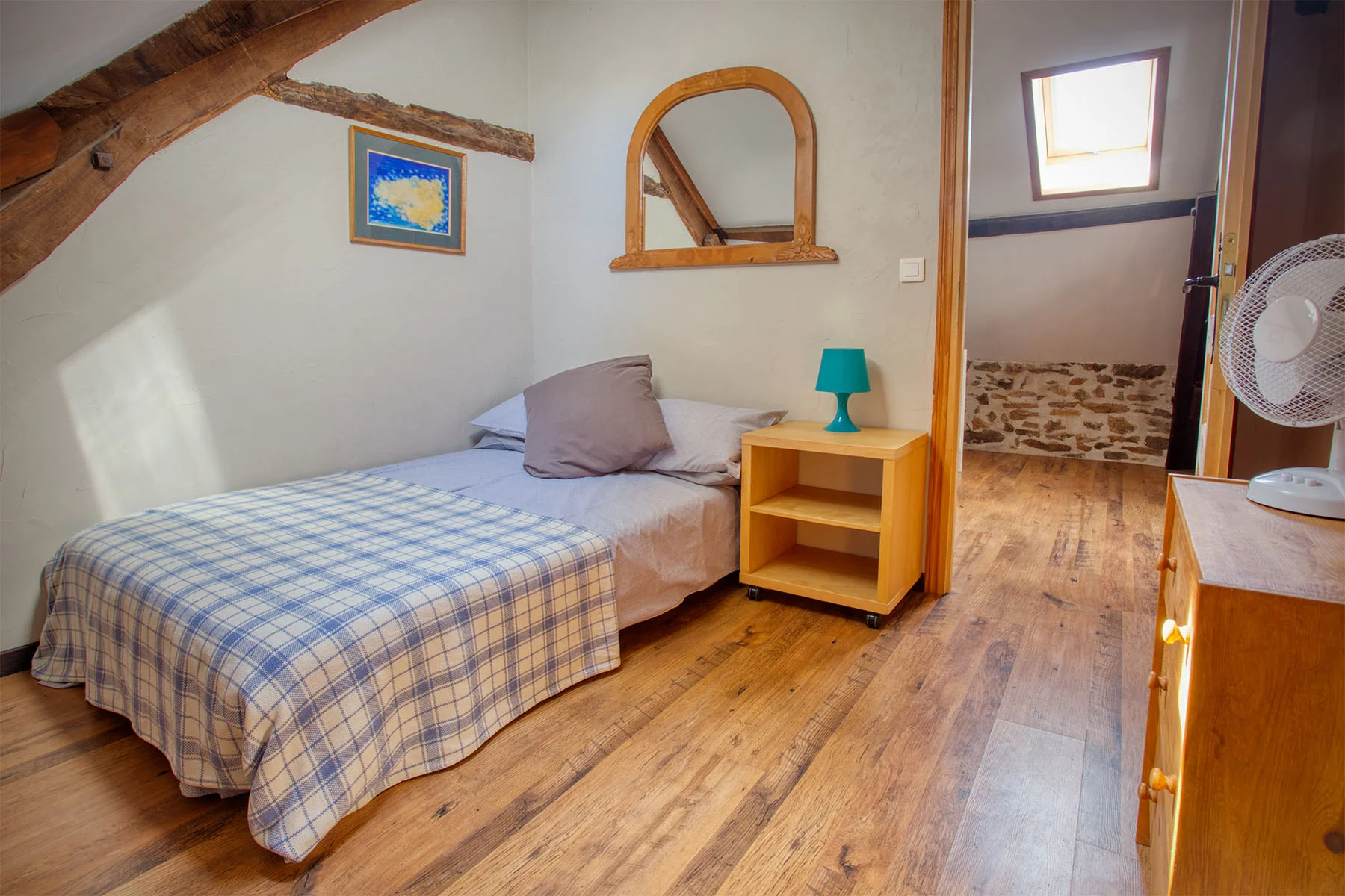 The master bedroom (6m x 3m) over-looks the garden, pool and gravelled area, and benefits from the evening sunlight. The room contains a double bed, 2 bedside units, a wardrobe and a chest of drawers. A fan is also provided for those hot summer evenings. The exposed stone walls and original features come together to produce a delightful room. There is plenty of space to put a cot or child's bed in this room, available on request.