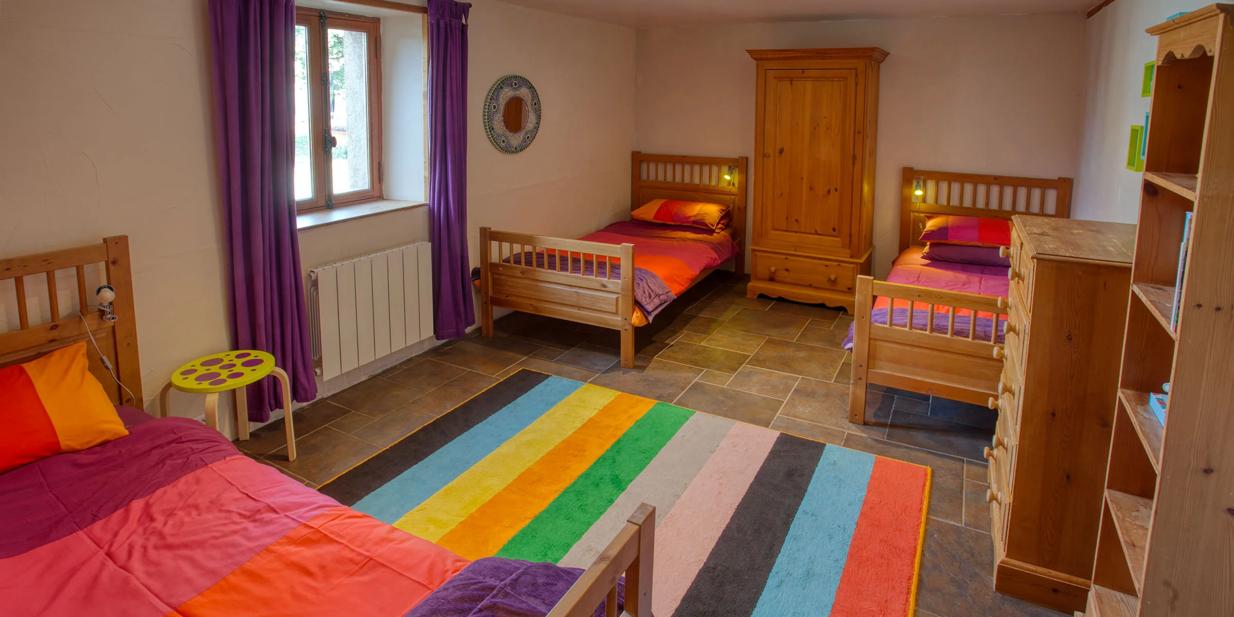 On entering the property there is ample hanging space for hats and coats, and a fridge intended for drinks. The first room leading off the entrance area is bedroom 4 (5m x 3.5m), known better as 'the kids room'. Here you will find a large room containing 3 single beds, perfect for large families or 2 families sharing where every night becomes a sleep-over. The room has plenty of floor space for playing games.